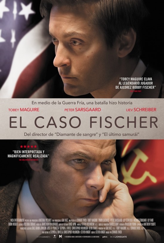 A Contracorriente Films ha lanzado el tráiler y cartel españoles de 'El caso Fischer', relato inspirado en hechos reales que ha dirigido Edward Zwick, responsable de títulos como 'Leyendas de pasión', 'El último samurái', 'Diamante de sangre' o más recientemente 'Jack Reacher 2'. Se trata de la historia del legendario enfrentamiento por el campeonato del mundo entre Bobby Fischer (Tobey Maguire), campeón de ajedrez norteamericano, y el campeón ruso Boris Spassky (Liev Schreiber). El duelo, que tuvo lugar en 1972, en plena Guerra Fría, fue mucho más que un conjunto de partidas para conquistar un campeonato; prueba de ello es que captó la atención televisada de todo el mundo... su estreno español, el próximo 12 de agosto.